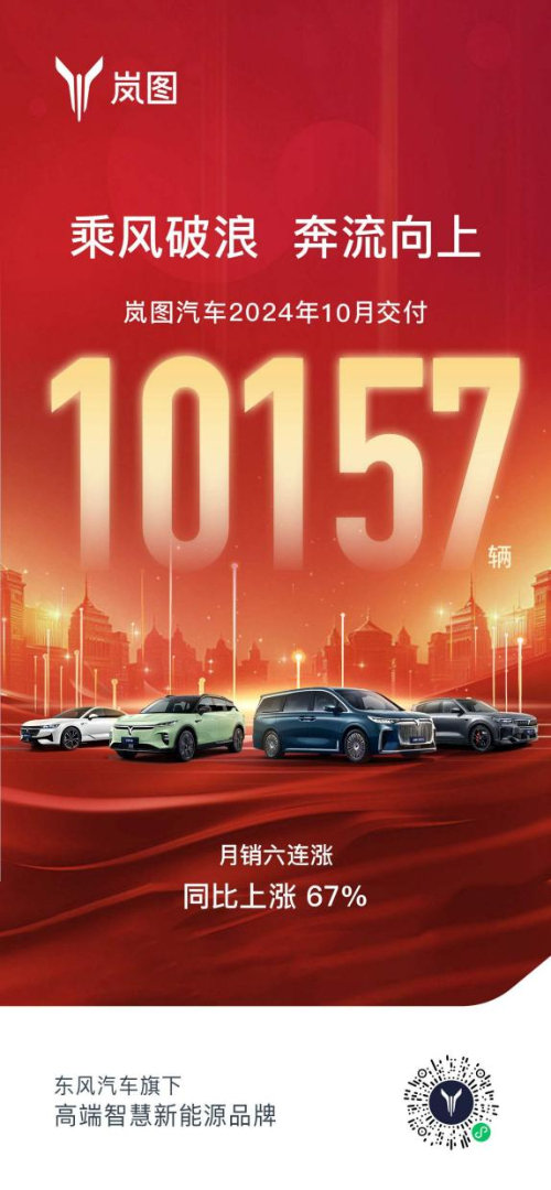嵐圖汽車成立4年來,得益于在產(chǎn)品、營銷、服務(wù)和品牌等領(lǐng)域的全面戰(zhàn)略布局和深耕細作,嵐圖汽車厚積薄發(fā),10月銷量10157輛,實現(xiàn)連續(xù)兩月銷量破萬、月銷“六連漲”,正以強勁勢頭走上發(fā)展快車道,穩(wěn)居發(fā)展最快的新能源“國家隊”車企行列。在激烈的市場競爭中,正是在包括嵐圖在內(nèi)所有中國新能源品牌的不斷突破下,中國新能源汽車再攀新高峰,達成年度首個1000萬輛的成就。