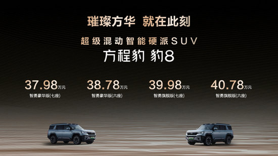11月12日,比亞迪華為聯(lián)合發(fā)布方程豹豹8上市,共發(fā)布4個款型,其中智勇旗艦六座版40.78萬元、智勇旗艦七座版39.98萬元、智勇豪華六座版38.78萬元、智勇豪華七座版37.98萬元。作為比亞迪30周年的旗艦之作,比亞迪華為首次聯(lián)合開創(chuàng)的智能硬派,豹8定義了國貨旗艦的頂級價值,開創(chuàng)了自己的價值公式——8=4x(1+1)。1臺豹8等于 4大王牌科技,乘以1套全家舒享豪華配置加1個非承載式硬派車身,以“智勇雙全”的非凡實力,引領(lǐng)全新生活方式,開啟全球智能硬派新時代。