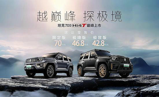 越巔峰,探極境。2月26日,“中國(guó)豪華越野旗艦”坦克700 Hi4-T發(fā)布上市,坦克700 Hi4-T限定版建議零售價(jià)70萬(wàn)元,極境版建議零售價(jià)46。8萬(wàn)元,極致版建議零售價(jià)42。8萬(wàn)元。