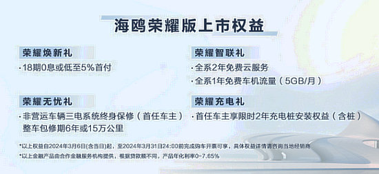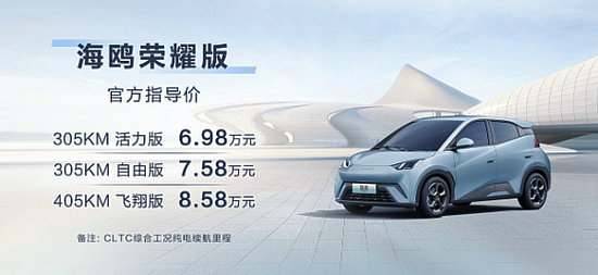 比亞迪海鷗自去年4月上市以來(lái)持續(xù)熱銷(xiāo),2023年以年銷(xiāo)280217輛的成績(jī)獲A00級(jí)市場(chǎng)年度銷(xiāo)冠。承襲冠軍品質(zhì)與高能實(shí)力,3月6日,海鷗榮耀版正式上市,官方指導(dǎo)價(jià)格為6。98萬(wàn)元-8。58萬(wàn)元。海鷗榮耀版增色降價(jià),新增北冰藍(lán)外觀+深海藍(lán)內(nèi)飾配色,以全新的配色方案與多彩個(gè)性體驗(yàn),豐富用戶的購(gòu)車(chē)選擇,更好滿足用戶的個(gè)性化需求。