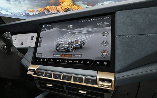 內飾方面,屏幕采用內嵌式設計,擁有 14。6 英寸超大屏幕尺寸,更簡潔牢靠,屏幕下方集成了大部分日常的功能按鍵,物理按鍵操控起來觸感更真實,更好的彰顯了 G318 科技與硬派合而兼得的特點。