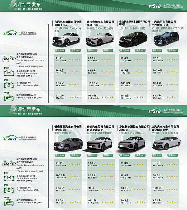 本次發(fā)布的C-AHI中國汽車健康指數(shù)2023年第五批次測評結(jié)果涵蓋了嵐圖Free(2022款DNADesign純電版)、奔馳C級(2023款C200L運動轎車)、哪吒S(2022款1160小版(增程))、廣汽傳祺GS8(2022款領航系列2。0TGDI四驅(qū)至尊版)、福特銳界L(兩驅(qū)五座時尚型)、奇瑞星途瑤光(2023款400T四驅(qū)奢享版)、小鵬G6(2023款580長續(xù)航Max)、大眾朗逸新銳(2023款1。5L手動新逸版)8款車型,發(fā)布包括了車內(nèi)揮發(fā)性有機化合物與車內(nèi)氣味強度(VOC&VOI)、車輛電磁輻射(EMR)、車內(nèi)顆粒物(PM)、車內(nèi)致敏風險(VAR)四個板塊的測評結(jié)果。