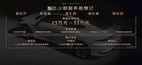當(dāng)日,智己L6正式開啟預(yù)售,預(yù)售價格區(qū)間:23萬元~33萬元。智己L6 Max標(biāo)準(zhǔn)版,不超過23萬元;智己L6 Max超強性能版,不超過29。99萬元;智己L6 Max光年版,不超過33萬元。同期,也公布了極具誠意的“限時預(yù)訂權(quán)益”,2000元意向金即可抵5000元購車尾款,以及10000元豪華配置升級基金。
