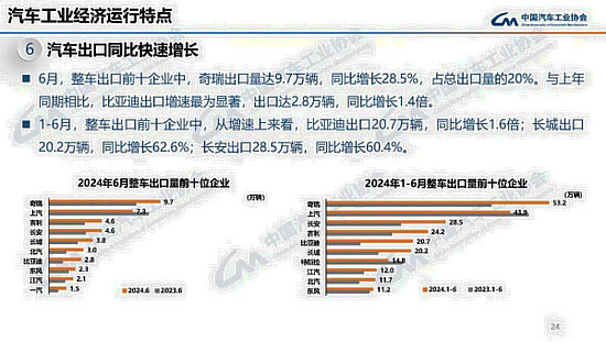 業(yè)內(nèi)人士分析表示,總體而言,2024年上半年中國(guó)汽車出口的顯著增長(zhǎng),既是企業(yè)技術(shù)和市場(chǎng)策略成功的體現(xiàn),也是中國(guó)制造在全球范圍內(nèi)影響力提升的具體表現(xiàn)。未來,隨著全球市場(chǎng)的進(jìn)一步開拓和技術(shù)創(chuàng)新的持續(xù)推進(jìn),中國(guó)汽車出口有望實(shí)現(xiàn)更高質(zhì)量的發(fā)展。