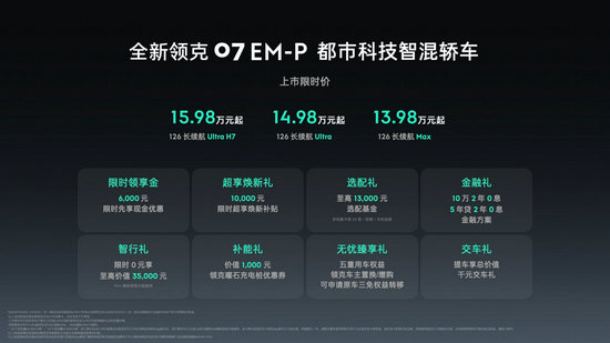 都市科技智混轎車全新領(lǐng)克07EM-P:上市限時(shí)價(jià)13.98萬(wàn)元起