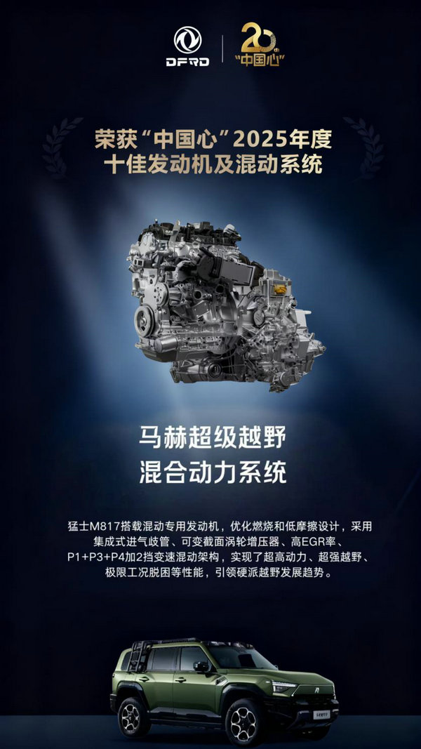 摘要:東風(fēng)自主動(dòng)力再次迎來高光時(shí)刻。近日,“中國(guó)心”2025年度十佳發(fā)動(dòng)機(jī)及混動(dòng)系統(tǒng)評(píng)選結(jié)果揭曉,東風(fēng)汽車自主研發(fā)的馬赫超級(jí)越野混合動(dòng)力系統(tǒng)斬獲“中國(guó)心”2025年度十佳發(fā)動(dòng)機(jī)及混動(dòng)系統(tǒng)大獎(jiǎng)。這是馬赫動(dòng)力自首次亮相以來,連續(xù)六年獲此殊榮,既彰顯了東風(fēng)汽車積淀深厚的技術(shù)功底,更標(biāo)志著中國(guó)品牌在新能源越野動(dòng)力領(lǐng)域的技術(shù)突破與領(lǐng)先地位。