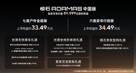 2026年1月31日前下訂并鎖單極石ADAMAS中國版,即可享受“首發(fā)定金膨脹禮遇”,5,000元定金直接抵扣20,000元尾款,并可疊加價值35,999元“絲滑用車無憂禮遇”、價值12,000元“絲滑全地形體驗禮遇”。