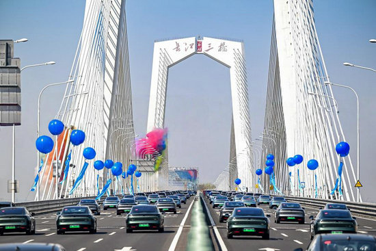 圖為3月18日,奇瑞全品牌車型組成的百車方陣,以智駕模式跨越蕪湖長(zhǎng)江三橋