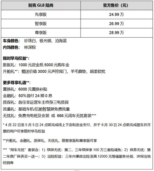 陸尚將采用“一口價(jià)”模式銷售,確保所有用戶都能享受到別克始終如一的頂尖品質(zhì)與高標(biāo)準(zhǔn)服務(wù)。即日起,用戶可通過(guò)別克官網(wǎng)、iBuick App、Buick小程序、別克抖音直播間,或別克全國(guó)授權(quán)經(jīng)銷商門(mén)店下定,可享受豐厚購(gòu)車權(quán)益。其中,5月5日24點(diǎn)前完成線上下定和定金支付,并于6月30日24點(diǎn)前完成提車并開(kāi)票的用戶更可享“早鳥(niǎo)”權(quán)益,包括:定金膨脹禮,下定支付1,000元抵5,000元購(gòu)車款;購(gòu)智享版、尊享版車型享“升艙禮”,免費(fèi)升級(jí)價(jià)值3,000元聲控尾門(mén)、羊毛腳墊和頭枕。