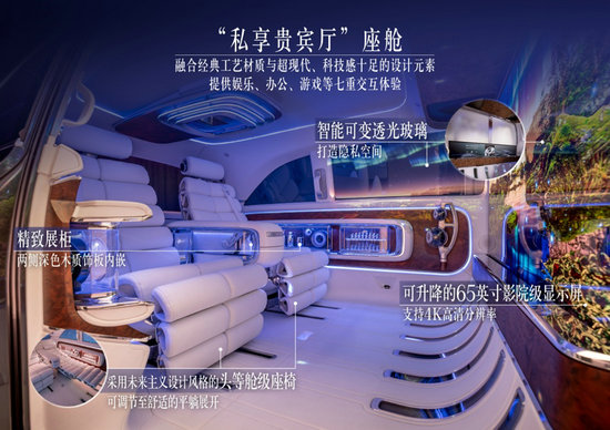Vision V 概念車重新定義豪華空間,營(yíng)造“私享貴賓廳”般的座艙體驗(yàn)。智能可變透光玻璃將乘客艙與駕駛艙分隔,可在毫秒間實(shí)現(xiàn)透明度的無級(jí)調(diào)節(jié),營(yíng)造自由、私密的駕乘空間。水晶白色Nappa皮飾與白色絲光綢緞,和大面積開孔胡桃木飾件形成鮮明對(duì)比,格調(diào)優(yōu)雅。頭等艙級(jí)座椅靈感源自優(yōu)雅經(jīng)典的休閑躺椅,采用未來主義設(shè)計(jì)風(fēng)格,多種調(diào)節(jié)模式為乘客提供極致呵護(hù),甚至可調(diào)節(jié)至舒適的平躺展開。兩側(cè)木質(zhì)飾板內(nèi)嵌精致展柜,為個(gè)人物品提供收納空間,雙獨(dú)立座椅之間的中控臺(tái)同樣設(shè)計(jì)為精致展柜,集成可折疊桌板,桌板展開后呈現(xiàn)為一塊精致的國(guó)際象棋棋盤,致敬經(jīng)典之美。