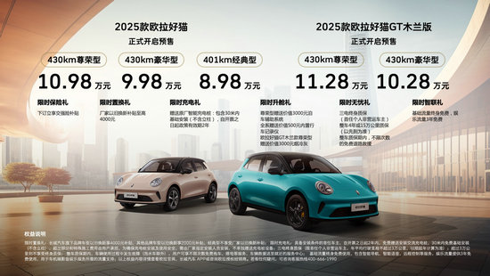 品鑒會(huì)上,2025款歐拉好貓和2025款歐拉好貓GT木蘭版正式啟動(dòng)預(yù)售,2025款歐拉好貓預(yù)售價(jià)格區(qū)間為8.98萬(wàn)-10.98萬(wàn)元,2025款歐拉好貓GT木蘭版預(yù)售價(jià)格區(qū)間為10.28萬(wàn)-11.28萬(wàn)元,用戶可通過長(zhǎng)城汽車官方APP,歐拉官方APP及歐拉ORA小程序進(jìn)行下訂。此外,從6月12日至上市當(dāng)日下訂且7月31日(含)前提車用戶還可享限時(shí)六重“好”禮,包含限時(shí)保險(xiǎn)禮、限時(shí)置換禮、限時(shí)充電禮、限時(shí)升艙禮、限時(shí)無(wú)憂禮、限時(shí)智聯(lián)禮等多重驚喜。
