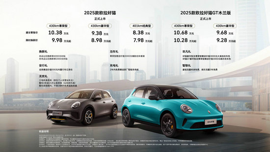 6月27日,以“經(jīng)典新生 潮而不凡”為主題的2025款歐拉好貓和2025款歐拉好貓GT木蘭版上市發(fā)布會(huì),在位于河北保定的長(zhǎng)城汽車技術(shù)中心啟幕。其中,2025款歐拉好貓的建議零售價(jià)區(qū)間為8.38萬(wàn)—10.38萬(wàn)元,限時(shí)換新價(jià)區(qū)間為7.98萬(wàn)—9.98萬(wàn)元;2025款歐拉好貓GT木蘭版的建議零售價(jià)區(qū)間為9.68萬(wàn)—10.68萬(wàn)元,限時(shí)換新價(jià)區(qū)間為9.28萬(wàn)—10.28萬(wàn)元。同時(shí),歐拉汽車還為下訂用戶提供了包含換新禮、泊車禮、非凡禮和安行禮等共7重限時(shí)“好”禮。