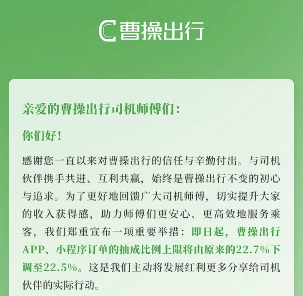 曹操出行則表示,將APP、小程序訂單的抽成比例上限將由原來(lái)的22.7%下調(diào)至22.5%,“這是我們主動(dòng)將發(fā)展紅利更多分享給司機(jī)伙伴的實(shí)際行動(dòng)”。