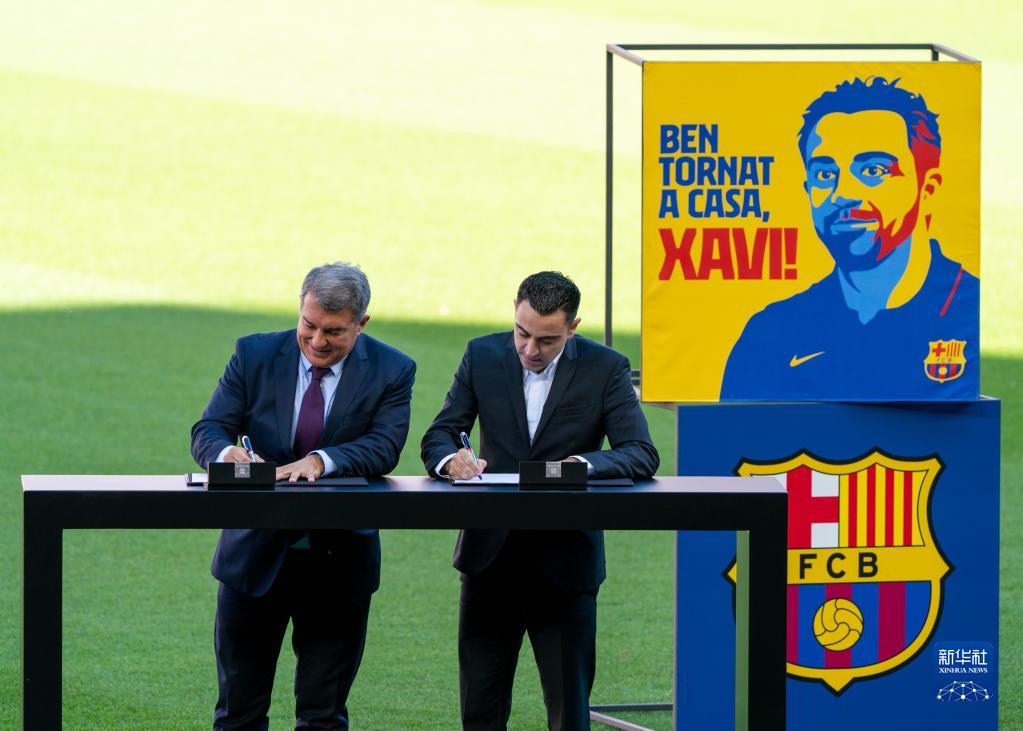 11月8日,哈維(右)與巴塞羅那俱樂部主席拉波爾塔在諾坎普球場簽署協(xié)議。