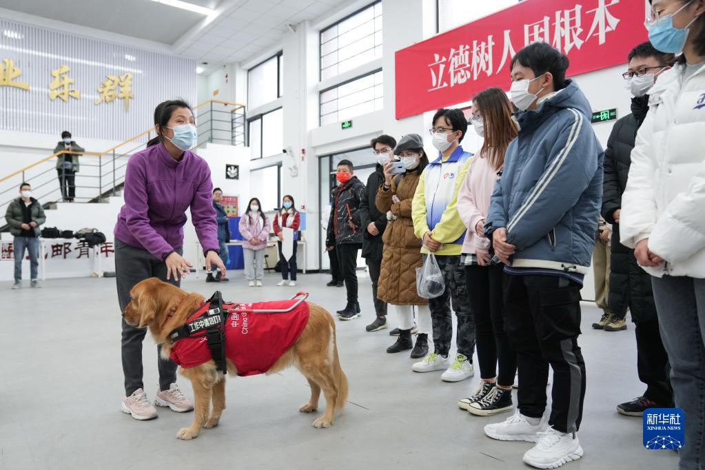 12月1日,在北京郵電大學(xué),來自通州區(qū)第二醫(yī)院中醫(yī)科的張冉(前左)帶著自己的導(dǎo)盲犬沙果為參加培訓(xùn)的志愿者介紹導(dǎo)盲犬的工作方式,讓志愿者了解如何為攜帶導(dǎo)盲犬的殘障人士服務(wù)。