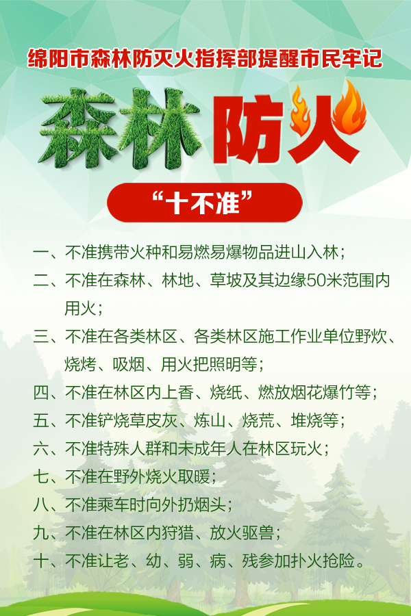 3月15日,省森林草原防滅火指揮部辦公室、省委宣傳部、省林業(yè)和草原局聯(lián)合印發(fā)《四川省森林草原防火宣傳月實(shí)施方案(試行)》,明確每年3月至4月為森林草原防火宣傳月,在此期間內(nèi),我省各地將開展“五個一”活動,聚焦重點(diǎn)人群,精選宣傳內(nèi)容,創(chuàng)新宣傳方式,全力營造“處處是戰(zhàn)場、人人皆戰(zhàn)士”的全民宣傳防火氛圍。