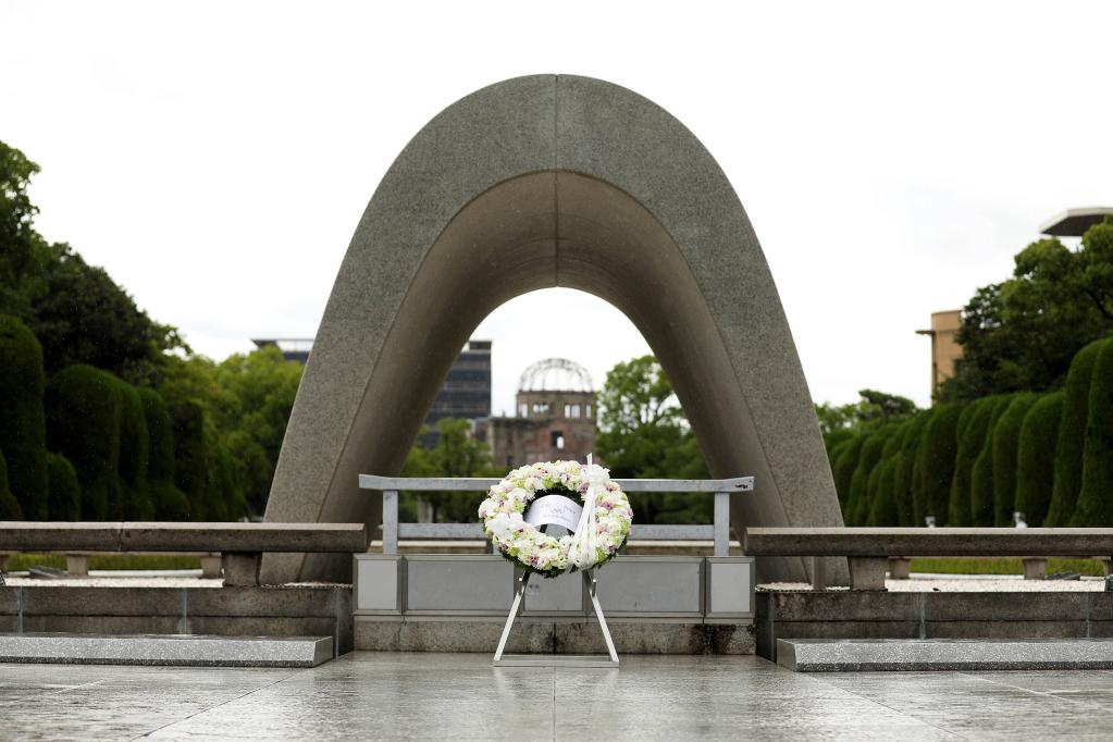 7月16日,在日本廣島和平紀念公園,巴赫向核爆慰靈碑獻花。