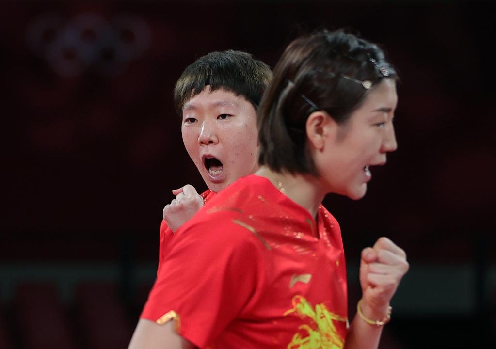 8月4日,中國隊組合陳夢/王曼昱(左)在比賽中。當(dāng)日,在東京奧運會乒乓球女子團體半決賽中,中國隊戰(zhàn)勝德國隊,晉級決賽。新華社記者 王東震 攝