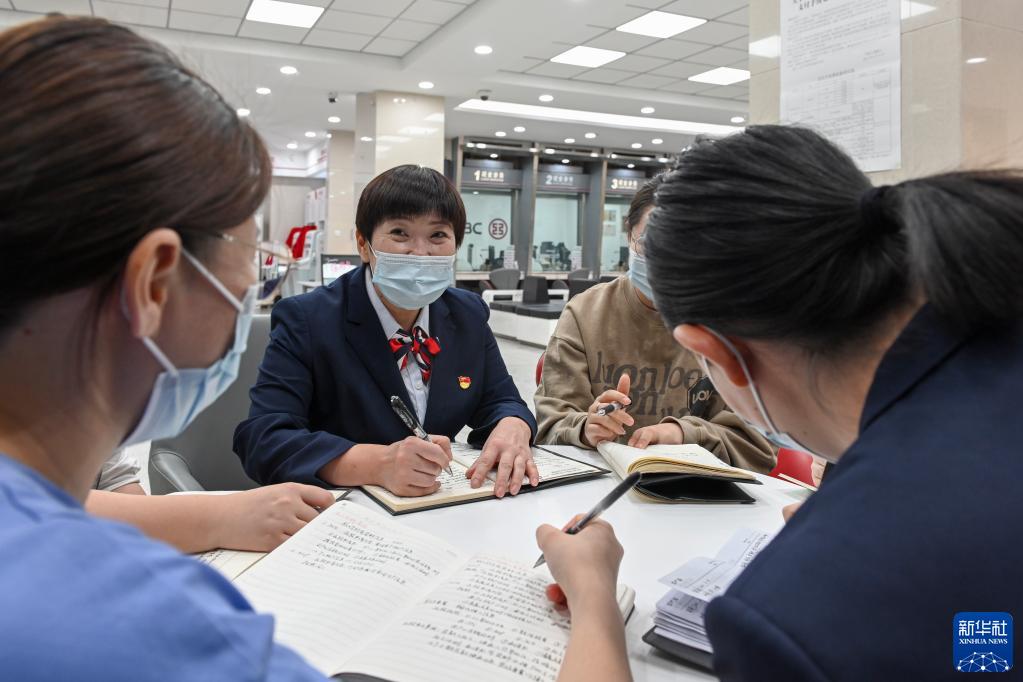 在中國工商銀行新疆烏魯木齊的一處營業(yè)網(wǎng)點,李鵬與員工進行業(yè)務(wù)交流(2022年9月24日攝)。新華社記者 郝建偉 攝