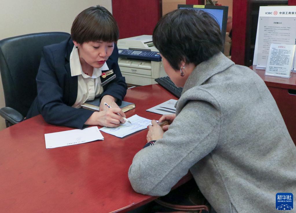 在中國工商銀行新疆烏魯木齊的一處營業(yè)網(wǎng)點,李鵬(左)為客戶解答問題(2018年11月攝)。新華社發(fā)
