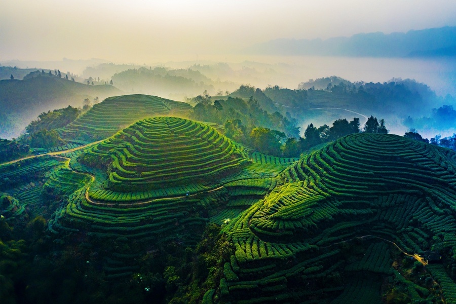 念好“優(yōu)、綠、特、強(qiáng)、新、實(shí)”六字經(jīng),大力培育川糧油、川菜、川茶等十大優(yōu)勢(shì)特色產(chǎn)業(yè),進(jìn)一步打響“川字號(hào)”品牌。圖為四川省雅安市名山茶園。