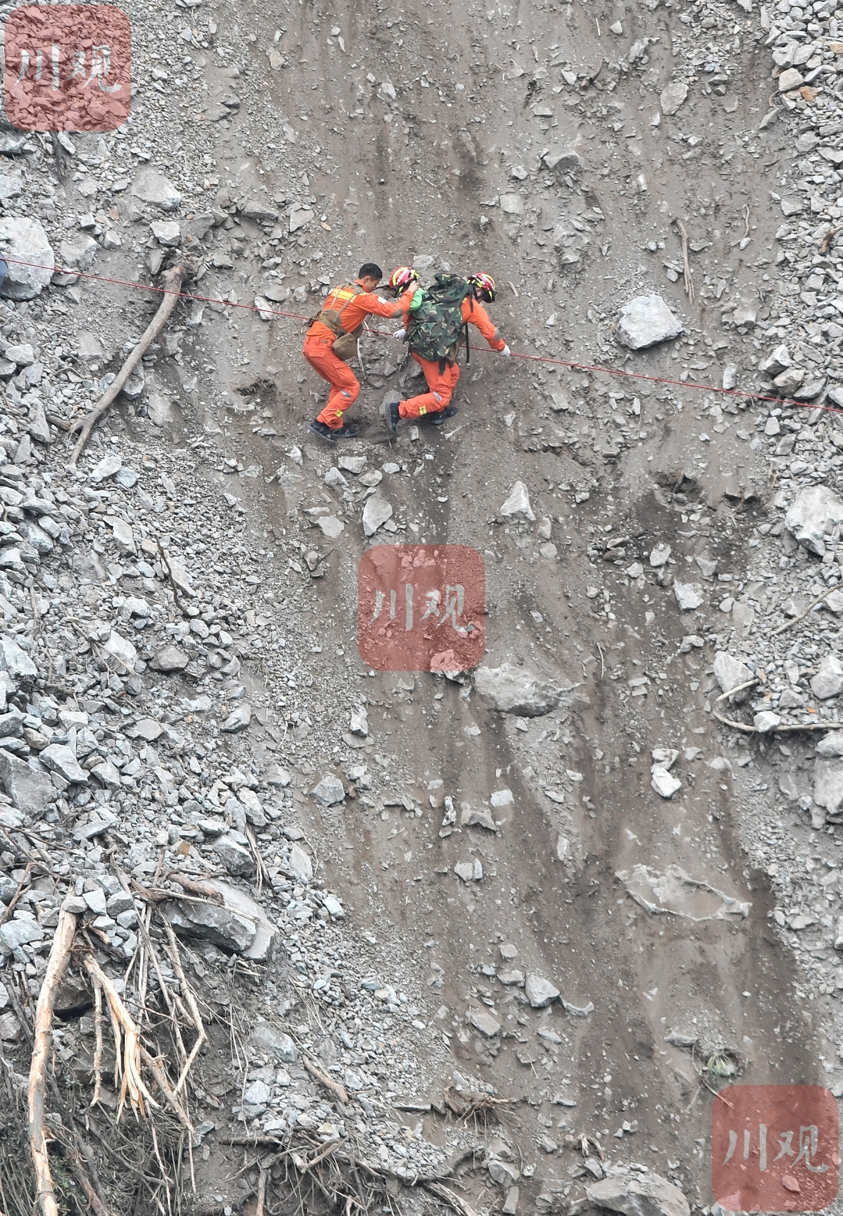 震后營(yíng)救,救援人員背負(fù)兩歲幼童穿越百米垂直滑坡帶。華小峰 攝