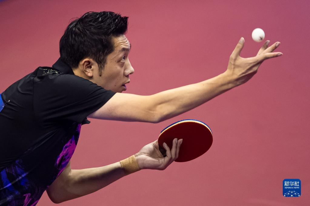 11月3日,上海地產(chǎn)集團(tuán)隊(duì)球員許昕在比賽中回球。許昕在男子團(tuán)體首輪比賽中以3比0戰(zhàn)勝?gòu)V西隊(duì)選手謝昀熹。新華社記者 肖藝九 攝