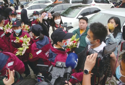 曹雨婷(右一)在援武漢醫(yī)療隊返綿采訪現(xiàn)場