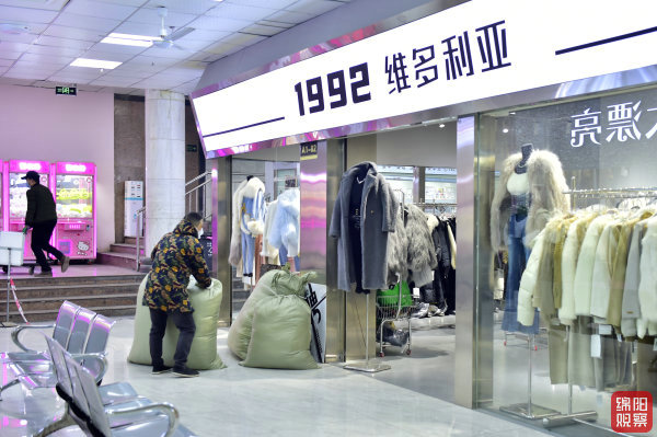 ↑12月18日,公園口地下商城,老板從倉庫拉來三大包服裝,忙著給店鋪補(bǔ)貨。