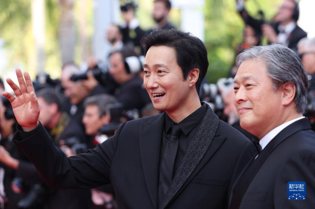 5月28日,在法國戛納舉行的第75屆戛納國際電影節(jié)上,《分手的決心》導(dǎo)演樸贊郁(右)、演員樸海日踏上閉幕式紅毯。