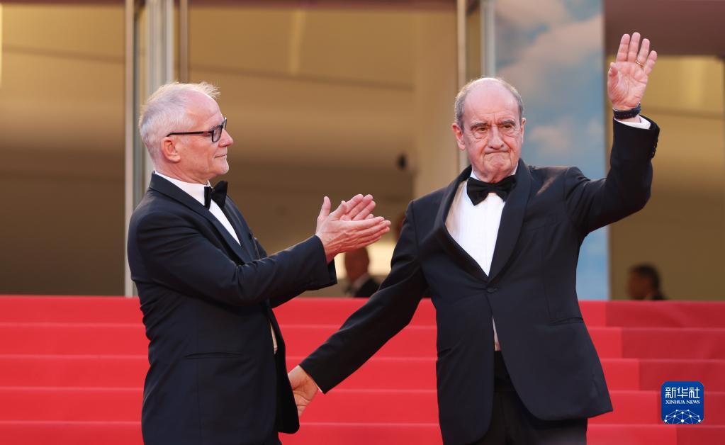 5月28日,在法國戛納舉行的第75屆戛納國際電影節(jié)上,戛納電影節(jié)主席皮埃爾·萊斯屈爾(右)與戛納電影節(jié)藝術(shù)總監(jiān)蒂埃里·弗雷莫在閉幕式開始前向觀眾致意。