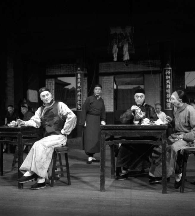 其實焦菊隱先生很早就有了“戲劇-詩”的觀點,而這種觀點從劇作分析轉(zhuǎn)化成導演理念,是在北京人藝落地的。大概正是因為有了“戲劇-詩”的導演理念,才成就了《茶館》的輝煌?!恫桊^》毫無疑問是中國現(xiàn)實主義戲劇的巔峰之作,而它的整體創(chuàng)作構思又充滿了“詩意”,其中給人留下印象最深刻的部分都充滿了詩的韻味和詩的邏輯:三幕戲一個場景卻跨越三個歷史結(jié)點,從一個茶館的變遷興衰折射出時代的變遷、國運的興衰——這樣象征性極強且前所未有的演劇結(jié)構,甚至為當代戲劇創(chuàng)作提供了一種范式;一大群活靈活現(xiàn)的人物由一個演員扮演父子兩代,內(nèi)里既有間離效果的幽默又有命運難逃的悲哀,這也讓人耳目一新;三位老人悲哀至極為自己“出殯”,那凄厲的呼喊和飄撒的紙錢,是在現(xiàn)實生活基礎上最動人心魄的詩意化升騰;最后王利發(fā)萬念俱灰拿著腰帶走入內(nèi)室,而屋外的光卻亮起來了,嘹亮的歌聲也響起來了……《茶館》這些充滿詩意的段落不是零散孤立的,是建立在整個演出內(nèi)在的詩意品格基礎上的。