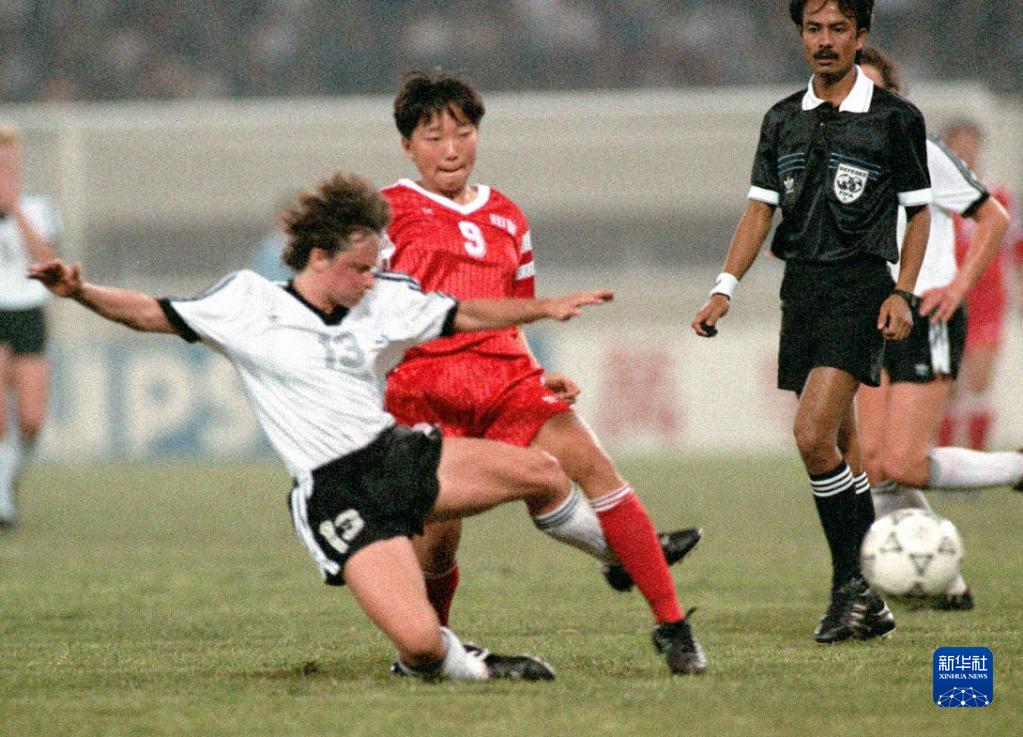 1991年11月21日,在首屆女足世界杯A組小組賽第三輪比賽中,中國隊?wèi)?zhàn)勝新西蘭隊,孫雯(左二)在比賽中拼搶。新華社記者官天一攝