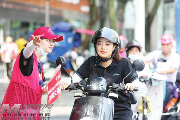 “妹妹,請你把頭盔戴好,這個路口車流量大,戴好頭盔才能保障你的安全。”在富樂大橋十字路口,交警正在勸導電動車駕駛員規(guī)范佩戴頭盔。一旁的志愿者也引導著來往人群和車輛按交通規(guī)則有序通行,原本繁忙的十字路口,在交警和志愿者們的引導下,變得秩序井然。