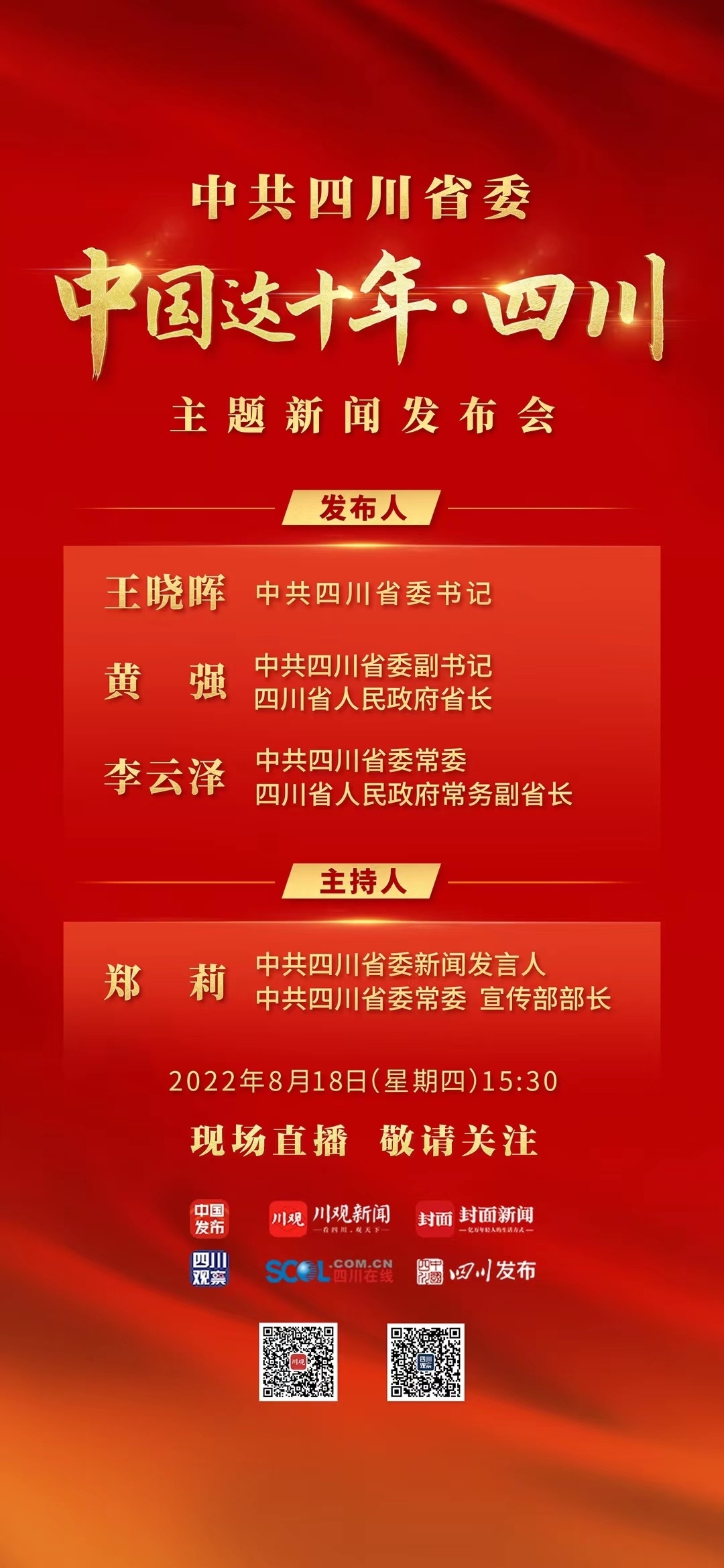 中共四川省委“中國這十年·四川”主題新聞發(fā)布會(huì)將于8月18日15時(shí)30分在成都舉行,川觀新聞客戶端將進(jìn)行全程直播。