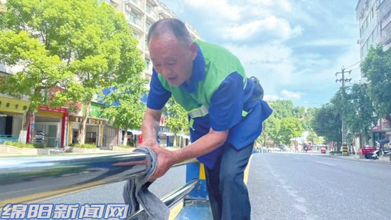 “秋老虎”天氣,炙熱、滾燙的街面令行人望而卻步。下午3時(shí)許,在鹽亭縣城紅光東路,環(huán)衛(wèi)工人杜松良正冒著烈日在清掃路面,擦拭欄桿。盡管額頭上滿是細(xì)密的汗珠,但他兩手的動(dòng)作仍舊干凈利落。