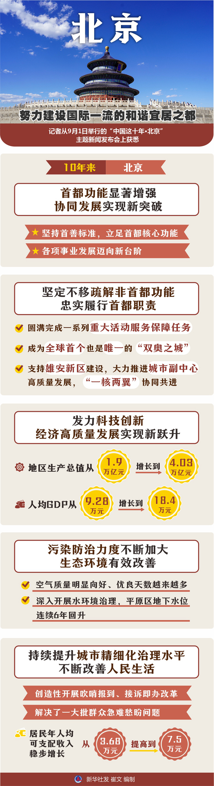 新華社北京9月1日電(記者王君璐)記者從1日舉行的“中國這十年·北京”主題新聞發(fā)布會上獲悉,黨的十八大以來,北京深入貫徹落實習近平總書記重要指示精神,全市上下牢記囑托、勇?lián)姑尕瀼匦掳l(fā)展理念,融入新發(fā)展格局,求真務實、砥礪奮進,努力建設國際一流的和諧宜居之都,在全面建設社會主義現(xiàn)代化國家新征程上奮力譜寫首都發(fā)展新篇章。