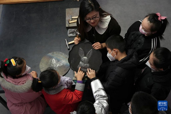 1月12日,在石家莊市新華區(qū)一個文化工作室,一名鐵板浮雕藝人向小朋友展示生肖兔作品。新華社記者 駱學(xué)峰 攝