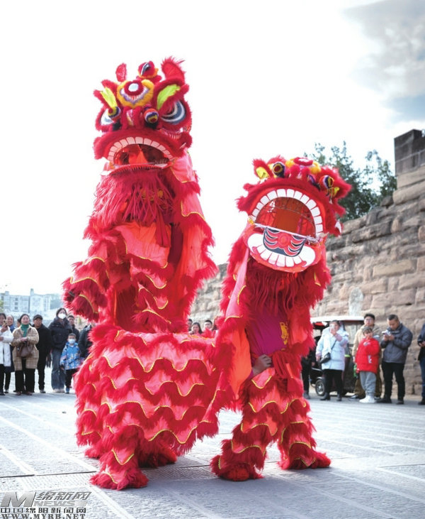 “好!”“再來一個(gè)!”正月初五,潼川古城醬園廣場不時(shí)傳來叫好聲,一場舞獅民俗表演引來水泄不通的人群。兩只“雄獅”配合默契,搔癢、打滾、掏耳朵、騰躍、翻滾……贏得現(xiàn)場游客陣陣歡呼和鼓掌。
