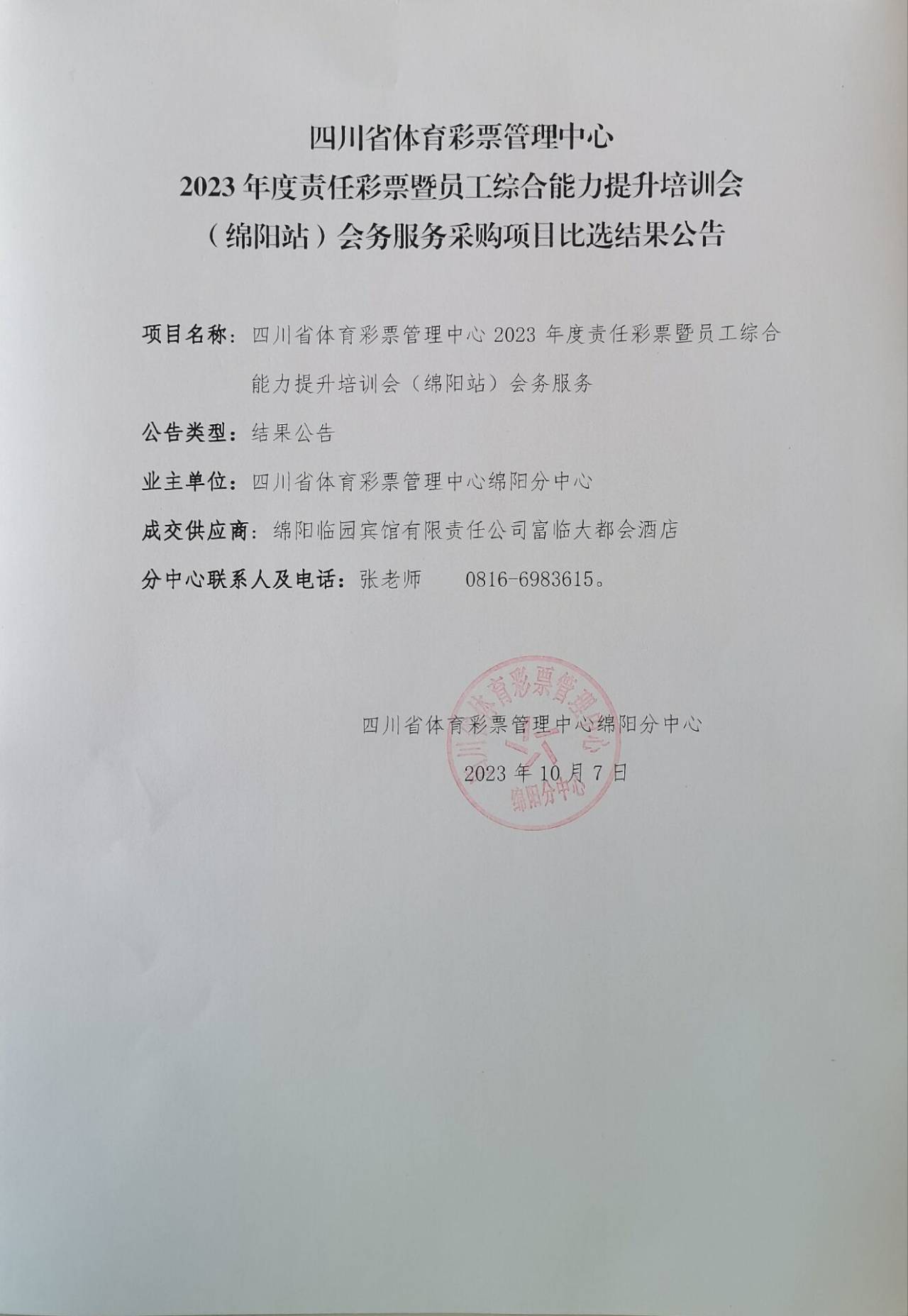 四川省體育彩票管理中心2023年度責(zé)任彩票暨員工綜合能力提升培訓(xùn)會(huì)(綿陽站)會(huì)務(wù)服務(wù)采購項(xiàng)目比選結(jié)果公告
