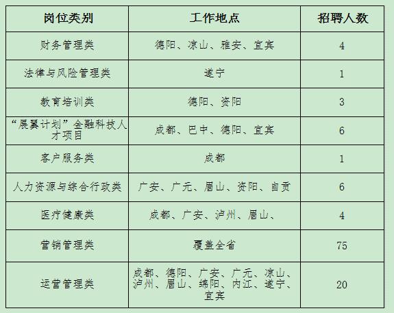 四川省公司省本部及下轄機(jī)構(gòu)共計擬招聘120人,崗位涵蓋“展翼計劃”銷售管理人才項目、“展翼計劃”金融科技人才項目、營銷管理類、醫(yī)療健康類、運(yùn)營管理類、財務(wù)管理類、客戶服務(wù)類、法律與風(fēng)險管理類、教育培訓(xùn)類、人力資源與綜合行政類等各類崗位,工作地點(diǎn)覆蓋全省。