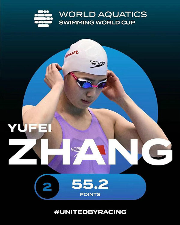 何詩蓓則以52秒02的成績改寫她9月底在杭州亞運會創(chuàng)造的女子100米自由泳亞洲紀錄52秒17,成為該項目歷史上第三快的選手,她還收獲了200米自由泳金牌和400米自由泳銅牌,在積分榜列第三名。