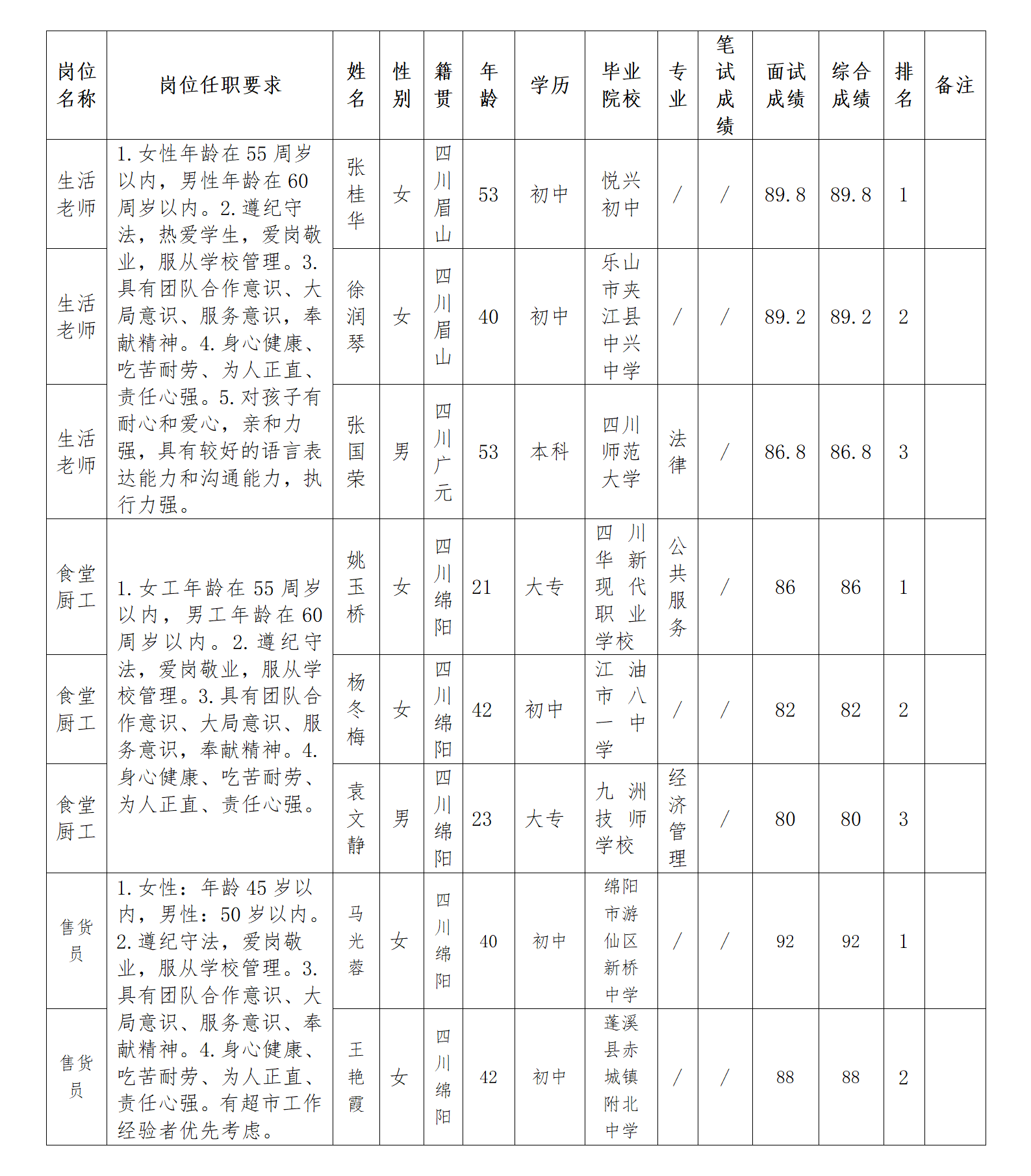 綿陽南山中學實驗學校關于生活老師等崗位招聘考核成績及排名的公示