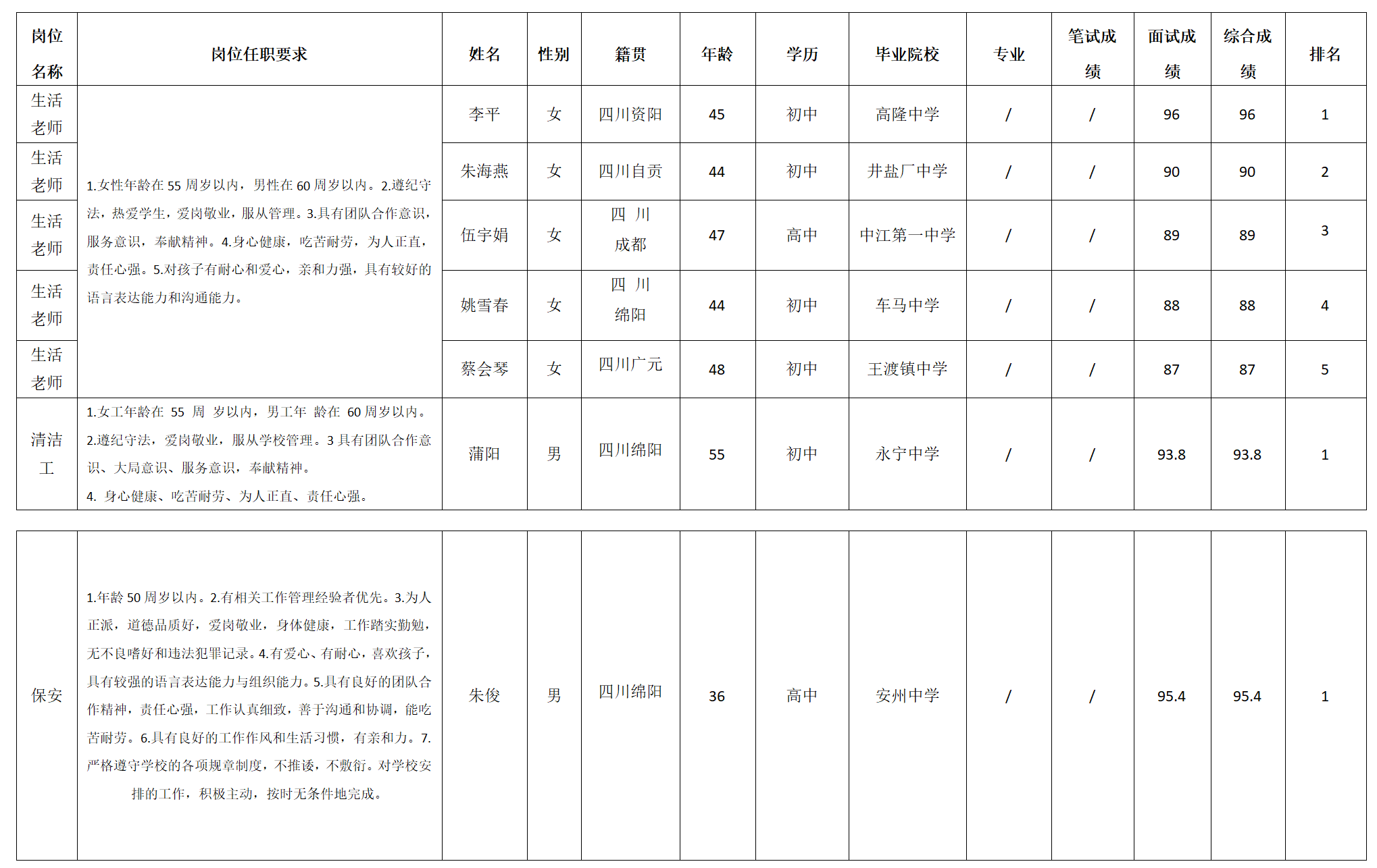 綿陽(yáng)中學(xué)實(shí)驗(yàn)學(xué)校關(guān)于招聘生活老師等崗位考核成績(jī)及排名的公示