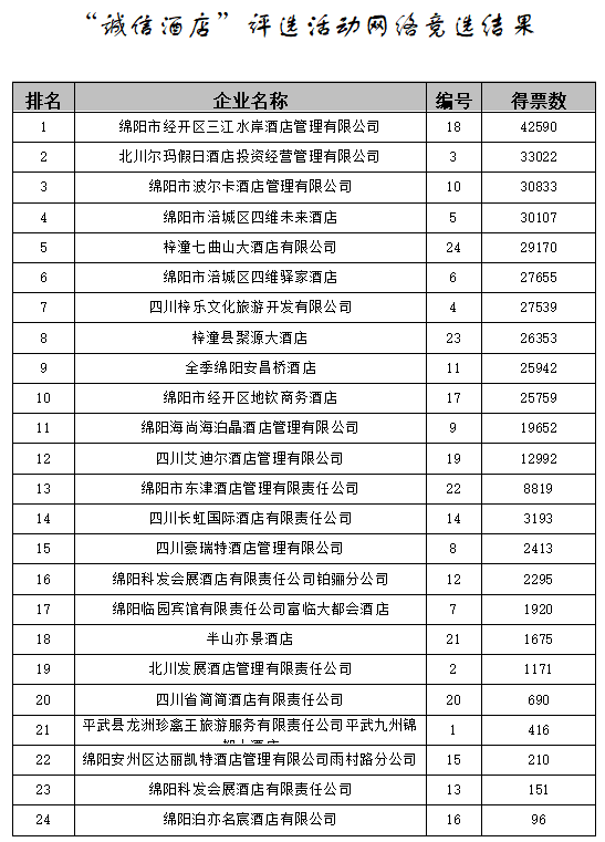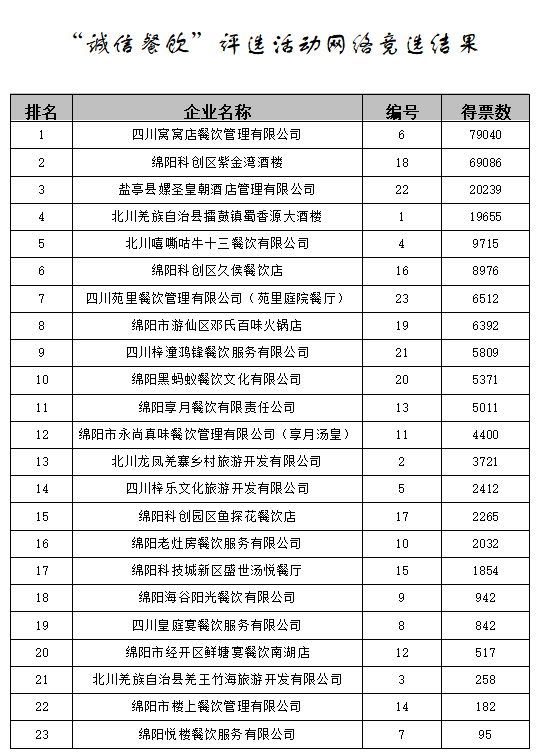 按照《綿陽市“誠信商超(酒店、餐飲)”評選活動方案》,2023年10月14日00:00:00至10月20日23:59:59,開展了“誠信商超(酒店、餐飲)”網絡競選,現將結果進行公示。