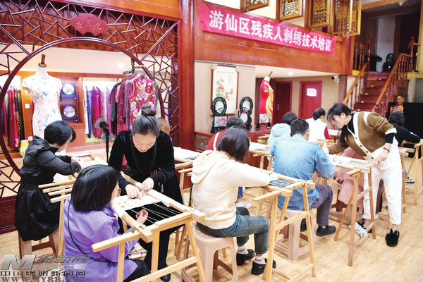 綿陽新聞網(wǎng)訊 窗外細雨霏霏,室內飛針走線,近日,在游仙區(qū)殘聯(lián)主辦的殘疾人刺繡技能免費培訓班上,10余位學員正在西蜀傳統(tǒng)刺繡工藝非遺傳承人周靜老師的精心指導下認真學習蜀繡技法。
