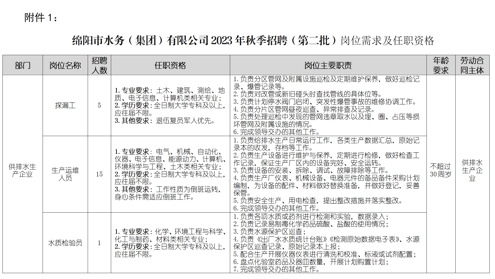 1.供排水公司:探漏工5名、生產(chǎn)運維人員15名、水質檢測員1名。