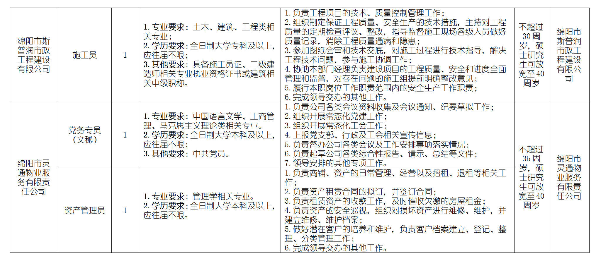 2.綿陽市斯普潤市政工程建設有限公司:預算員1名、會計1名、黨務人事專員1名、合同專員1名、施工員崗1名。