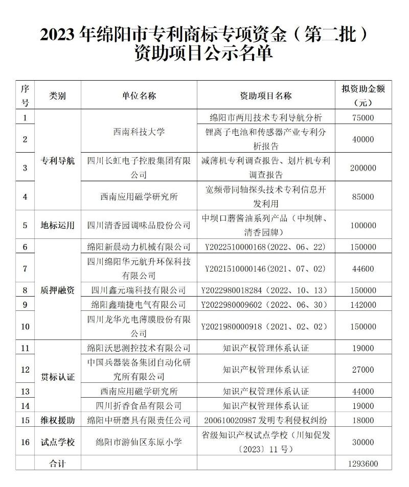 附件:2023年綿陽市專利商標(biāo)專項資金(第二批)資助項目公示名單