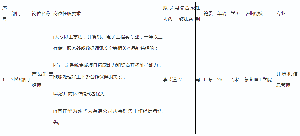 根據(jù)四川長虹佳華信息產(chǎn)品有限責(zé)任公司發(fā)布的招聘公告及招聘相關(guān)規(guī)定,經(jīng)筆試、面試、考察、體檢等程序,擬錄用李榮道同志到四川長虹佳華信息產(chǎn)品有限責(zé)任公司工作,現(xiàn)予以公示,具體情況如下: